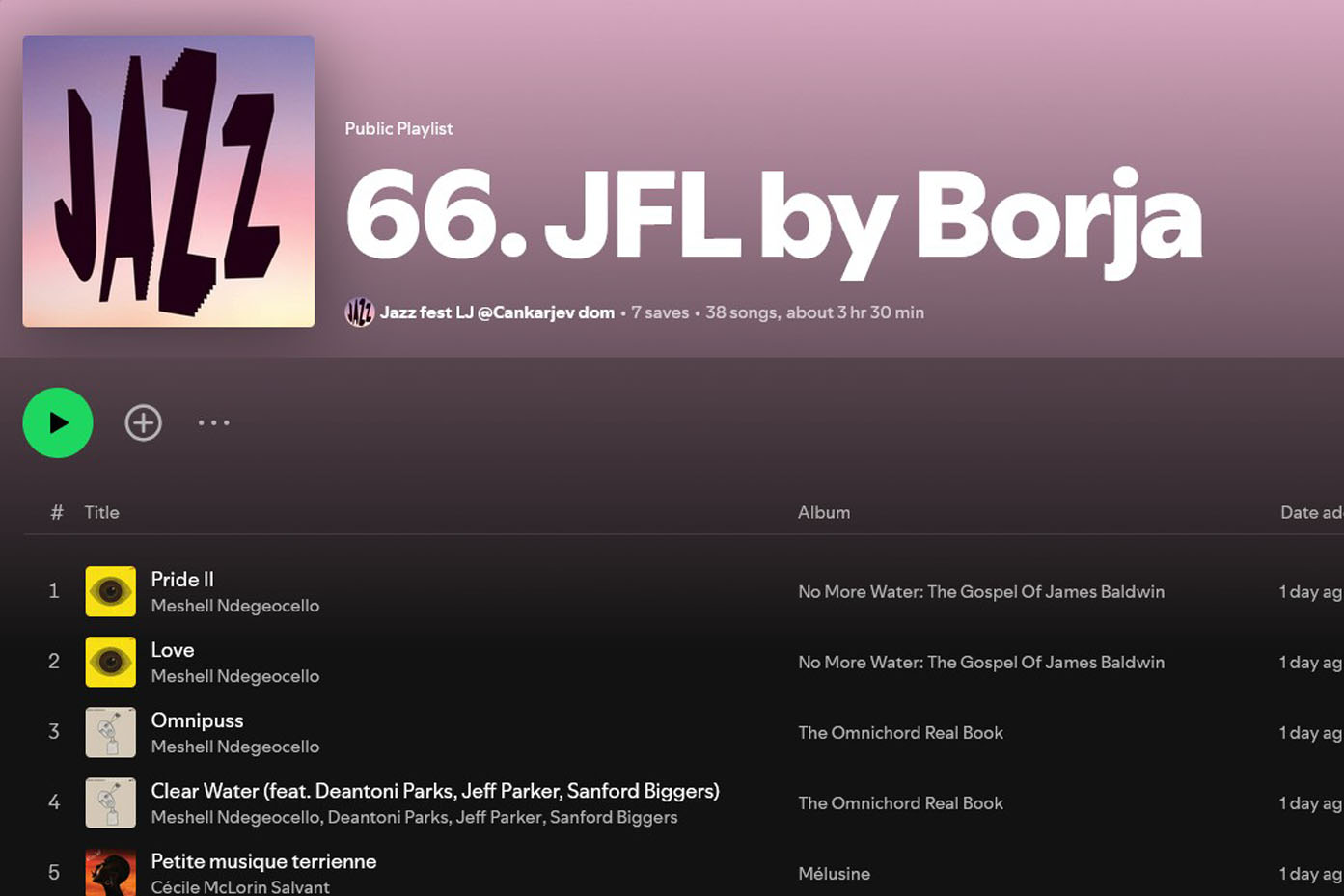 Zavrti si plejlisto 27.05.2025 admin.jazz Prisluhni plejlisti 66. edicije Jazz festivala Ljubljana, ki jo je pripravil programski ko-kurator Borja Močnik – Borka. Share: